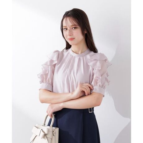 袖フリルが華やかなブラウス。表地に程よいシアー感のある薄手の素材を使い、ふんわりと軽やかな印象に見せてくれます。ボトムスにウエストインすると袖が映えるのでおすすめ。オン・オフ問わず着やすく、幅広いコーディネートに活躍してくれます。