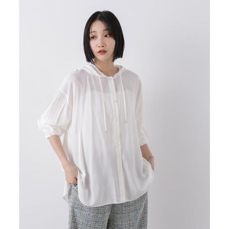 軽やかな着心地がポイントのルーズシルエットシャツ。程よい透け感と、柔らかいソフトな風合いの素材で仕立てた一着。フード付きのカジュアルなデザインながら、落ち感のあるシアー素材が上品さをプラスしてくれます。