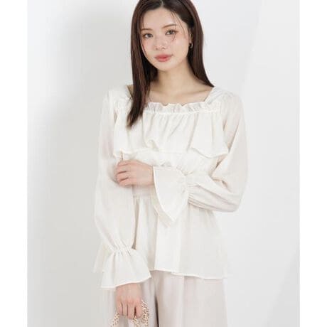 一枚でさらっとコーディネートが決まるブラウス。デコルテのフリルが顔まわりを華やかに演出し、ウエストは程よくマークされてスタイルアップも叶えます。デニムパンツと合わせたカジュアルミックスな着こなしも楽しめます。
