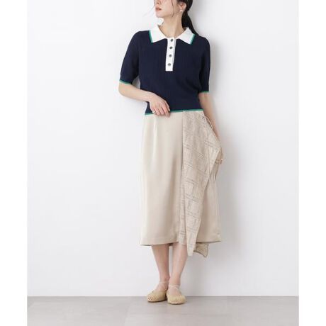 女性らしいサテン生地と刺繍レースコンビのデザインスカート。スクエア型の刺繍レース布を切り替えに挟み込み、サイドでリボン留めをしてヘムを垂らすデザインで、他にはない個性が光る一着。ドレッシーな素材感なので、あえてカジュアルなブルゾンやポロニットなどと合わせた今期らしいスタイリングがおすすめです。