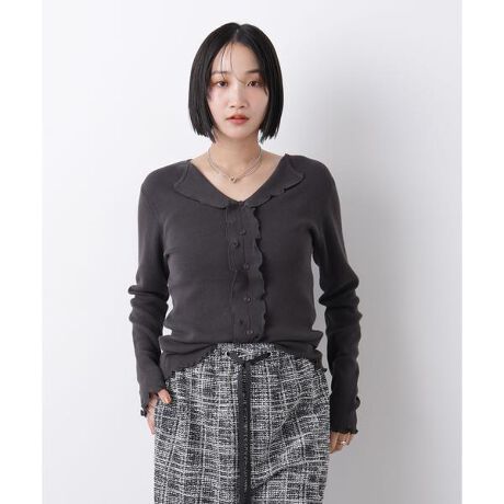 フロントに入ったフリルが女性らしい印象を引き立てるニットトップス。ややコンパクトなシルエットとすっきりとした衿周りとのバランスで甘さを抑えたデザインに。シンプルなボトムスと合わせるだけでしっかりとアクセントになってくれる一着です。
