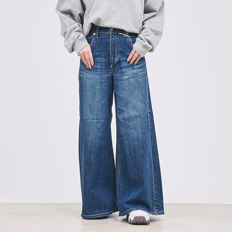 ハイライズのスーパーワイドシルエットデニム。ポイントは、ウエストとワタリの差寸。ウエストはキュッと高めの位置でやや小さめに設定し、ワタリからモモにかけて一気に広がるのが特徴です。メンズのパンツを、ウエストでギュッとしめたイメージのデザインになっています。パターン形状にこだわり、立体的に筒状に広がるようにすることで野暮ったさがなく、トレンド感溢れる1本に。