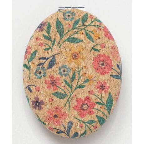 [型番:LCOP6122-2026]コルク素材にレトロな花柄をあしらったリエージュミラー。片面は拡大鏡仕様でメイク直しにも便利。旅先にも携帯しやすいコンパクトサイズです。