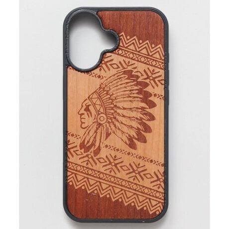 [型番:ASJP6105-2026]ネイティブアメリカンの象徴的モチーフを彫刻したウッドケース。なめらかな手ざわりと美しい木目が特徴で、ナチュラルながらも存在感のある一品。対応機種:iPhone17