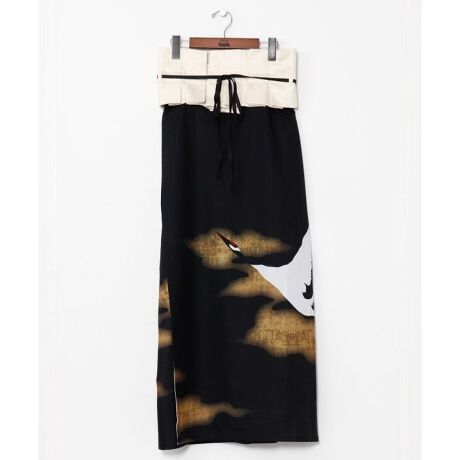 [型番:76L-6103-2026]ジャカード生地の帯と無地スカートを組み合わせたセット商品。鶴と瑞雲の縁起柄が華やかで、帯の裏にはしっかりと固定できる仕様を施しています。帯は取り外し可能で、自由な着こなしを楽しめます。同シリーズのトップスと合わせると、和の雰囲気を感じる上品な装いをお楽しみいただけます。3WAY着用可能。