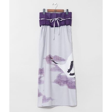 [型番:76L-6103-2026]ジャカード生地の帯と無地スカートを組み合わせたセット商品。鶴と瑞雲の縁起柄が華やかで、帯の裏にはしっかりと固定できる仕様を施しています。帯は取り外し可能で、自由な着こなしを楽しめます。同シリーズのトップスと合わせると、和の雰囲気を感じる上品な装いをお楽しみいただけます。3WAY着用可能。