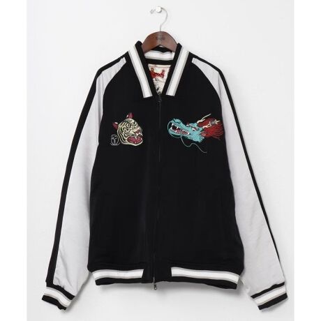 [型番:76L-6110-2026]【倭物やカヤ×鈴木ひょっとこ】コラボのジャケット。伝統×現代の融合を魅力的に描く、画家・鈴木ひょっとことのコラボ商品。表面には描き下ろしの「龍虎」刺しゅう、裏面は「大漁」をモチーフにした総柄デザインのリバーシブル仕様。和装の衿元をイメージしたデザインが上品な印象を添え、サテン生地のなめらかな肌触りも魅力。デニムやワンピースなど和洋問わず自在にコーデを楽しめるユニセックスの和モダンスタイルを演出する一枚です。リバーシブル着用可能。