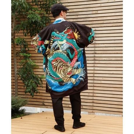 [型番:76R-6101-2026]【倭物やカヤ×鈴木ひょっとこ】コラボのリバーシブル羽織り。伝統×現代の融合を魅力的に描く、画家・鈴木ひょっとことのコラボ商品。描き下ろしの「龍虎」、「風雷」「ミーアキャット」が大胆に描かれ、表裏で異なる表情を楽しめるデザインです。さらりとしたポリエステル素材で扱いやすく、和装にも洋服にも合わせやすいユニセックスデザイン。現代に映える新感覚の和スタイル羽織りです。リバーシブル着用可能。