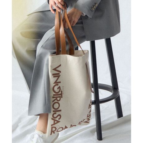 ブランド名をグラフィカルにアレンジしたロゴプリントが目を惹く、縦長シルエットのトートバッグです。「VINGT-TROIS」はフランス語で23を意味しています。幅32cm×高さ43cmのサイズ感で、A4サイズの書類や雑誌、パソコンももすっきりと収まります。マチのないフラットな形状がスタイリッシュで、小脇に抱えても様になるデザインです。 ハンドル部分にはスムース調のフェイクレザーを使用し、カジュアルな中にも高級感をプラス。ハンドルの根元にあしらわれた、垂れ下がるようなカットデザインがさりげないアクセントになっています。 デイリーなお出かけのメインバッグとしてはもちろん、通勤時のサブバッグとしても活躍。シンプルなデニムスタイルやワンピースコーデに合わせるだけで、洗練された大人のカジュアルスタイルが完成します。 カラーは、コーディネートの鮮やかなポイントになるレッド(#010)、ナチュラルで上品なキャメル(#034)、シックでモダンな印象のブラック(#005)の3色展開です。