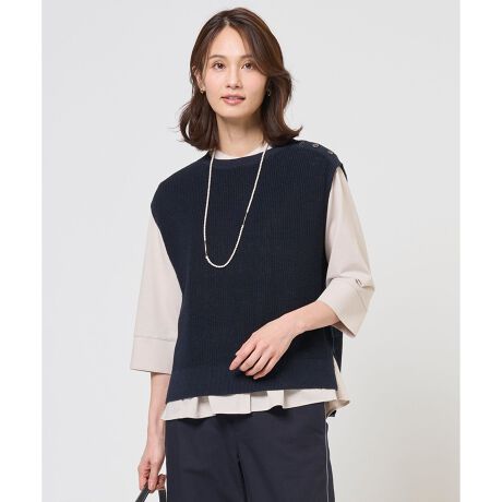 表情豊かな素材で魅せる、春夏のレイヤードスタイル!肩釦がアクセントのニットベスト