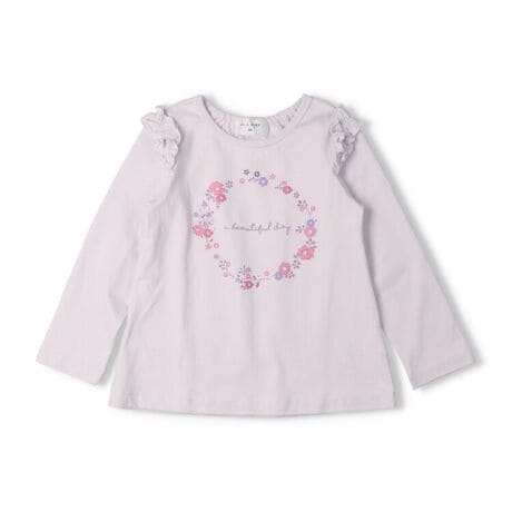 ネットショップと専門店、セレクトショップ限定のアイテム!直営店では直営オンラインショップ「こどもの森e-shop」各店のみでの販売になります。【直営実店舗での販売はありません。】お花とロゴのプリントが入った女の子らしいプリント長袖Tシャツ、ロンT。肩のフリルもガーリーなポイント!ふんわりと広がるAラインのシルエットが女の子らしさを引き立てます!衿ぐり後ろはゴムの仕様になっているので、着脱も楽ちん。デイリーにお出かけにも着やすいアイテム。【アイテム】トップス シンプル ガーリー フェミニン カジュアル お洒落 オシャレ かわいい 可愛い 普段着 デイリーウェア お出かけ着 お外着 お外遊び着 子ども こども 女児 女の子 ガールズ キッズ ベビーサイズ トドラーサイズ 幼稚園 保育園 小学校 通園 通学 小学生 2026年春夏物新作 丸高衣料 ロングスリーブ 長袖 ラベンダー 薄紫色 ベージュ コットン100% 綿100%