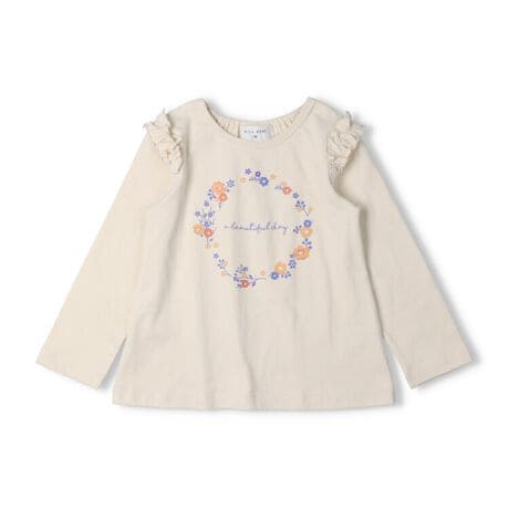 ネットショップと専門店、セレクトショップ限定のアイテム!直営店では直営オンラインショップ「こどもの森e-shop」各店のみでの販売になります。【直営実店舗での販売はありません。】お花とロゴのプリントが入った女の子らしいプリント長袖Tシャツ、ロンT。肩のフリルもガーリーなポイント!ふんわりと広がるAラインのシルエットが女の子らしさを引き立てます!衿ぐり後ろはゴムの仕様になっているので、着脱も楽ちん。デイリーにお出かけにも着やすいアイテム。【アイテム】トップス シンプル ガーリー フェミニン カジュアル お洒落 オシャレ かわいい 可愛い 普段着 デイリーウェア お出かけ着 お外着 お外遊び着 子ども こども 女児 女の子 ガールズ キッズ ベビーサイズ トドラーサイズ 幼稚園 保育園 小学校 通園 通学 小学生 2026年春夏物新作 丸高衣料 ロングスリーブ 長袖 ラベンダー 薄紫色 ベージュ コットン100% 綿100%