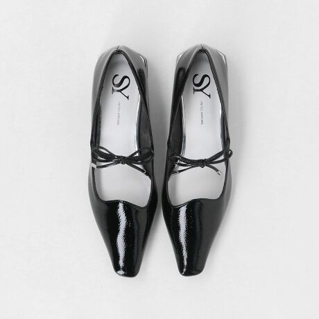 履き口のゆるやかなウェーブカットと甲に施されたリボンが印象的なフラットシューズ。