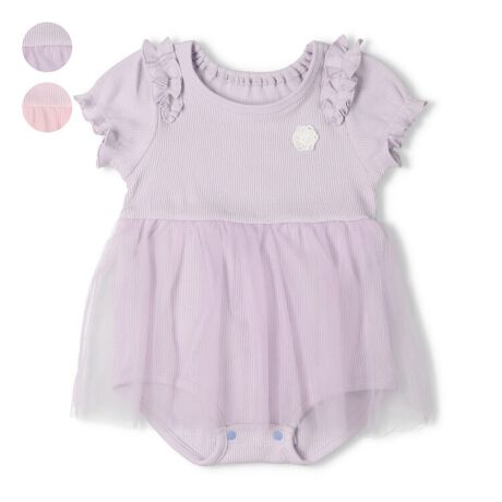 伸縮性のあるリブ素材の身頃にふんわりチュールのスカート。コーディネートが1枚で決まるブルマデザインの半袖Tオール、ロンパース。肩のフリルやお花のモチーフもガーリーな印象。股下のボタン仕様の被りで着せるデザインになります。【アイテム】プレゼント ギフト 赤ちゃん服 ベビー服 贈り物 トップス ボトムス つなぎ カジュアル お洒落 オシャレ かわいい 可愛い 普段着 デイリーウェア お出かけ着 ロンパース Tオール 長袖 ロングスリーブ 子ども こども 女児 女の子 ガールズ キッズ ベビーサイズ 保育園 通園 2026年春夏物新作 丸高衣料 お花 ラベンダー 薄紫色 ピンク キッズズー コットン100% 綿100%