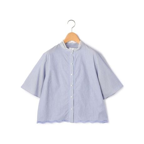 コットンベースのさらっとした素材を用いたシャツブラウス。特筆すべきは着丈の短さと、それとは相反するような量感の袖とのコントラスト。程よいリラックス感とモードな感性を備えた仕上がりになっています。ヘムラインはレースのようなカッティングを施し、存在感を高めているのもポイント。デニムなどを合わせてクリーンに楽しみたいアイテムです。