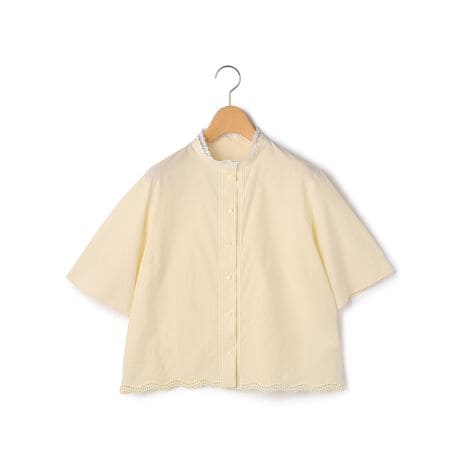 コットンベースのさらっとした素材を用いたシャツブラウス。特筆すべきは着丈の短さと、それとは相反するような量感の袖とのコントラスト。程よいリラックス感とモードな感性を備えた仕上がりになっています。ヘムラインはレースのようなカッティングを施し、存在感を高めているのもポイント。デニムなどを合わせてクリーンに楽しみたいアイテムです。