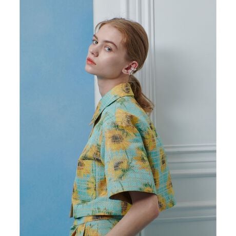 イタリアのEFFEPIERRE SPA(エッフェ・ピエッレ・エスピーエー)社のインポート素材を使用。日本ではなかなか目にしない個性的な糸使いと、ひまわりモチーフが印象的なジャガードです。ターコイズベースに鮮やかなイエローが美しく映え、着るだけで気分が上がる存在感のある一着。
