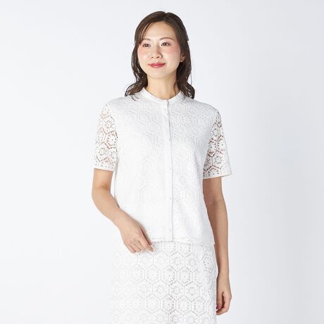幾何学模様をベースにしながらも、レースならではの表情で優雅な印象に仕上げたカットソー。甘さがある素材をシャツ仕立てにすることで、品の良い表情になっています。バンドカラー仕立てのため、首まわりにスカーフやショールなどを合わせるアレンジも楽しめます。背面はカットソー地で切り替えており、上着などを羽織りやすいのもポイントです。