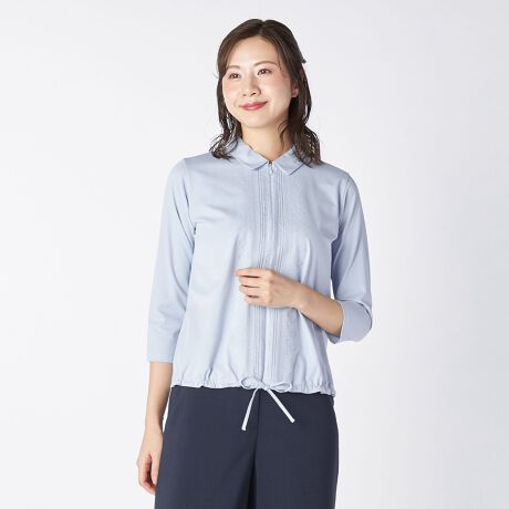 コットンをベースにしたカットソー地を用いたジップ式のシャツ。フロントに添えた緻密で繊細なステッチが、装いの品格を高めるアクセントになっています。裾をドローコードで絞ることも可能。合わせるボトムスによってシルエットを調節することができます。フロントを開けてラフに羽織るスタイルも、エレガントにまとまります。
