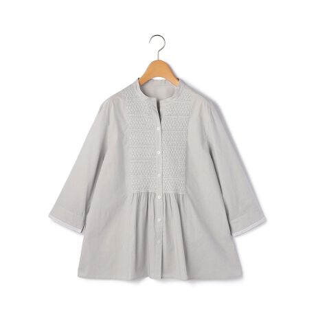 コットンをベースにしたさらっとした素材を用いたブラウス。着こなしをさわやかに映し出す細いストライプとフロントヨークに施した緻密なステッチが、大人の気品を引きたてるアクセントになっています。首まわりは開放感のある仕立てながらも、バンドカラーを採用しきちんとした印象。裾にかけてゆったりと広がるシルエットで、抜け感のあるスタイリングを演出します。