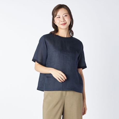 夏の着こなしに心地よさをもたらす麻素材を用いたプルオーバー。リラックス感のあるシルエットながらも軽やかなハリのある素材で、着こなしに品位をもたらす1点です。胸元に添えたポケットや、袖口や襟元に配したニットのトリミングがカジュアルなアクセント。仄かな透け感があり、大人らしい色香も漂わせるアイテムです。