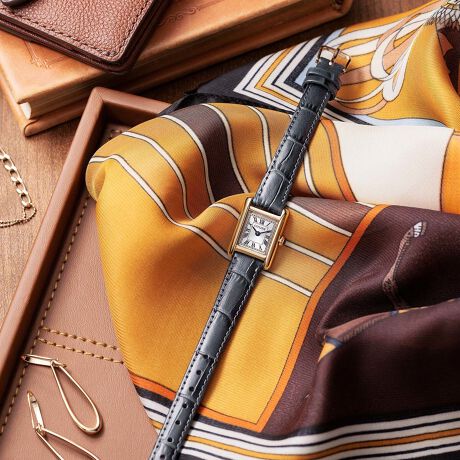ローマ数字で統一したインデックスと型押しを施した牛革バンドが、落ち着きのあるクラシカルな表情を際立たせています。少し大きめのりゅうずが小ぶりなケースにアクセントを添えます。