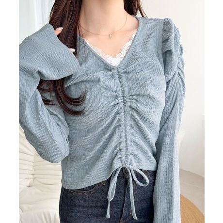 程よい深さのVネックが抜け感を演出し、縦のドロストリボンでシャーリングの調節できるのがポイント!
