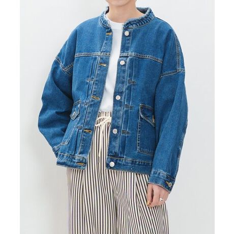 すっきりとしたノーカラーデザインのデニムジャケットです。
