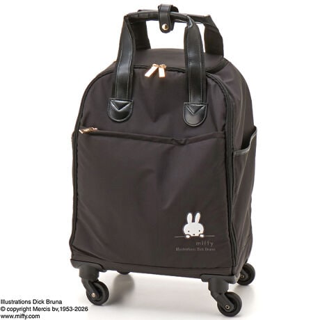 国内線100席以上の機内持ち込み対応サイズ。キャリーバッグ前面の右下にはミッフィーが刺繍されています。内装の柄はミッフィーのお顔がいっぱいの総柄。キャリーバッグを開閉するファスナートップには『miffy』が刻印されており、細部までミッフィー仕様のデザインです。