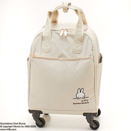 国内線100席以上の機内持ち込み対応サイズ。キャリーバッグ前面の右下にはミッフィーが刺繍されています。内装の柄はミッフィーのお顔がいっぱいの総柄。キャリーバッグを開閉するファスナートップには『miffy』が刻印されており、細部までミッフィー仕様のデザインです。