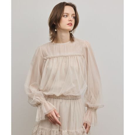 [型番:0326141349]チュールのボウタイ付きブラウス。プリーツやギャザー等を用いて重なったチュールの陰影が美しく、華やかな印象を与えるデザイン。同シリーズでおつくりした刺繍チュールスカート【品番:0326121349】のご用意もございます。※こちらのモデル着用画像はサンプル品を撮影しております。実際の商品と仕様、加工、サイズが若干異なる場合がございます。予めご了承くださいませ。