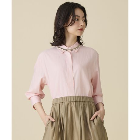 1枚でもレイヤードにも!衿まわりはすっきり袖はほんのりふんわりの上品シャツ■デザインコンパクトな衿に幅広の比翼前立てを合わせた、上品なデザインのシャツブラウスです。袖には程よいボリュームを持たせ、ベーシックなシャツをより洗練された印象へとアップデートしています。羽織りの中に合わせても、一枚で着ても上品に決まります。カフスには二つの釦をあしらい、袖口を広めにして今年らしい表情を楽しむスタイルと、すっきりとまとめて上品に着こなすスタイルの両方を楽しんでいただけます。 ■素材ヨーロッパのメゾンブランドをはじめ、世界中に顧客を持つトルコの BEZ TEKSTIL社で作られた、セルロース100%のポプリンシャツ素材です。繊維が細く毛羽立ちの少ないマイクロ糸を使用しているため、シャープでコンパクトな風合いと、繊細で滑らかなタッチが特徴です。美しいドレープ性に加え、ほどよいハリとコシも併せ持つ、しなやかなブラウス素材です。■同素材ブラウス(BLW7LM0309)