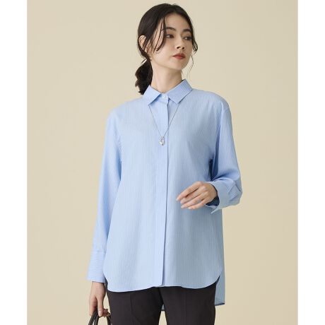 衿まわりはすっきり袖はほんのりふんわりの上品シャツ■デザインコンパクトな衿に幅広の比翼前立てを合わせた、上品なデザインのシャツブラウスです。袖には程よいボリュームを持たせ、ベーシックなシャツをより洗練された印象へとアップデートしています。羽織りの中に合わせても、一枚で着ても上品に決まります。カフスには二つの釦をあしらい、袖口を広めにして今年らしい表情を楽しむスタイルと、すっきりとまとめて上品に着こなすスタイルの、2WAYを楽しんでいただけます。 ■素材ヨーロッパのメゾンブランドをはじめ、世界中に顧客を持つトルコの BEZ TEKSTIL社で作られた、セルロース100%のポプリンシャツ素材です。繊維が細く毛羽立ちの少ないマイクロ糸を使用しているため、シャープでコンパクトな風合いと、繊細で滑らかなタッチが特徴です。美しいドレープ性に加え、ほどよいハリとコシも併せ持つ、しなやかなブラウス素材です。■同素材ブラウス(BLWRLM0309)