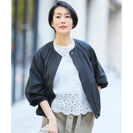 ロングシーズン頼れる!さっと羽織れるほどよいシアー感のブルゾン■デザインフォルムのあるバレルスリーブが印象的なノーカラーブルゾンです。衿ぐりにはギャザーとドローストリングを施し、顔まわりにさりげない華やぎをプラスしています。裾にもギャザーを入れることで、身頃にほどよい丸みと立体感を持たせたシルエットに仕上げました。前後差のある裾が軽やかな動きを生み、気になるヒップまわりも自然にカバーしてくれます。袖口はゴムギャザー入りで、たくし上げれば抜け感のあるスタイリングも楽しめます。ほんのりシアーな軽い素材を使用しており、長い期間活躍してくれる一着です。■素材ナイロンとコットンの細番手糸を高密度に織り上げたポプリン素材です。コットンを混紡することで、アウター素材でありながらも程よくナチュラルなタッチを感じられるのが特徴です。さらに、仕上げにエアウォッシュ加工を施すことで、自然な柔らかさと表情が生まれ、しなやかさと適度なハリ感を兼ね備えた風合いに仕上げています。