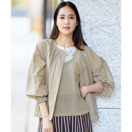 ロングシーズン頼れる!さっと羽織れるほどよいシアー感のブルゾン■デザインフォルムのあるバレルスリーブが印象的なノーカラーブルゾンです。衿ぐりにはギャザーとドローストリングを施し、顔まわりにさりげない華やぎをプラスしています。裾にもギャザーを入れることで、身頃にほどよい丸みと立体感を持たせたシルエットに仕上げました。前後差のある裾が軽やかな動きを生み、気になるヒップまわりも自然にカバーしてくれます。袖口はゴムギャザー入りで、たくし上げれば抜け感のあるスタイリングも楽しめます。ほんのりシアーな軽い素材を使用しており、長い期間活躍してくれる一着です。■素材ナイロンとコットンの細番手糸を高密度に織り上げたポプリン素材です。コットンを混紡することで、アウター素材でありながらも程よくナチュラルなタッチを感じられるのが特徴です。さらに、仕上げにエアウォッシュ加工を施すことで、自然な柔らかさと表情が生まれ、しなやかさと適度なハリ感を兼ね備えた風合いに仕上げています。