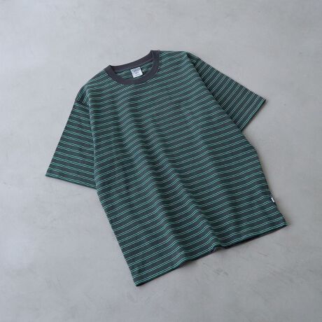 〇オリジナル配色の落ち着いたマルチボーダーに、ヴィンテージ風ネームでさりげない個性をプラス