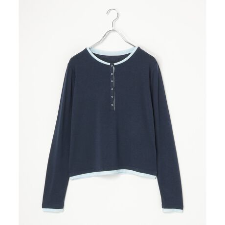 ヘンリーネックのほどよいラフさに、配色ディテールで今の気分を添えた一枚。