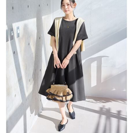 【ショート】エンボス素材Aラインワンピース