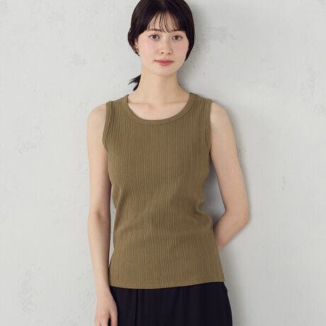 ランダムなリブが縦のラインを強調し、すっきりとした印象のタンクトップ。