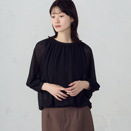 透け感があり、ギャザーをふんだんに入れたバルーンデザインのブラウス。