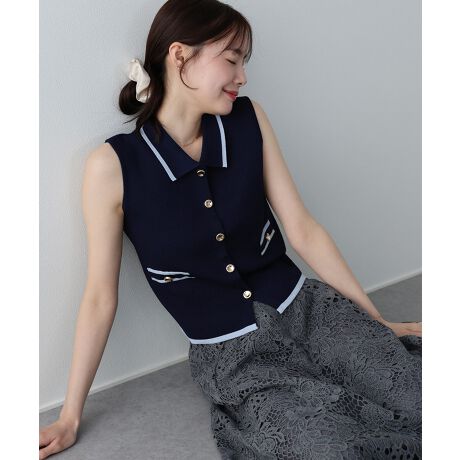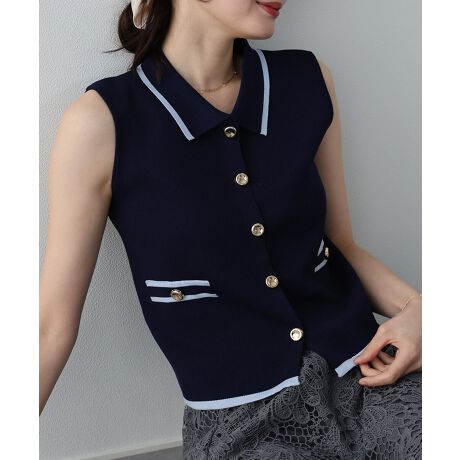 ゴールドボタンがきちんと見えするノースリーブポロニット