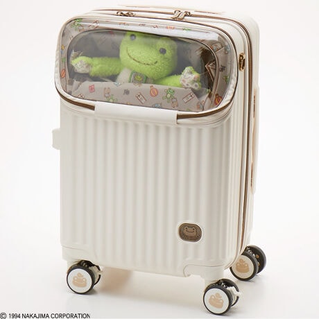 かえるのピクルスのぬいぐるみが1体付いたスーツケース。スーツケース前面にはピクルスのアンティーク調のプレートが付いており、キャスターにもピクルスが描かれています。スーツケースを開閉するファスナートップもアンティーク調で、「pickles the frog」と刻印されています。内装の生地もピクルスの総柄。細部までピクルスデザインにこだわっています。