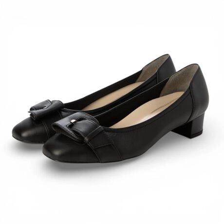 リズ ラフィーネでソフトな足当たりが支持されている定番人気モデル(RRLF13200)と同じ木型を使用した、新デザインのバックル付きパンプス。