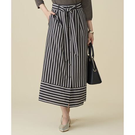 きれいめにもカジュアルにも映えるAラインスカート■デザインすっきりとしたAラインシルエットが魅力のスカートです。ウエストにはゴムとタックを配し、程よいゆとりを持たせながらも、腰まわりを美しく見せる仕立てにしています。フロントのボタンをさりげないポイントに、裾のスリットが上品な軽やかさを添えます。ブラウスはもちろん、カットソーなどとのスタイリングも楽しんでいただけます。■素材トルコのMARSALA社に別注した、自由区オリジナルのストライプ先染め素材です。さりげなくドビー組織を施すことで、程よい立体感を出した表情が特徴のストライプ柄に仕上げています。タテ糸にナイロン、ヨコ糸にヴィスコースを使用しており、適度なしなやかさと心地よい肌触りが魅力です。■同素材ワンピース(OPW7LM0312)