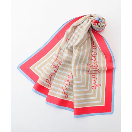 ■デザインストライプ柄にフランス語で書かれた自由区のブランドメッセージをプリントした、大判のシルクスカーフです。首元に巻いたりバッグに結んだりすると、縁の配色がさりげないアクセントとなり、スタイリングを引き立てます。同系色ストライプ柄のワンピース(OPWMLM0312)やスカート(SKWMLM0312)と合わせていただくと、さらに装いにさりげないアクセントを添えてくれます。