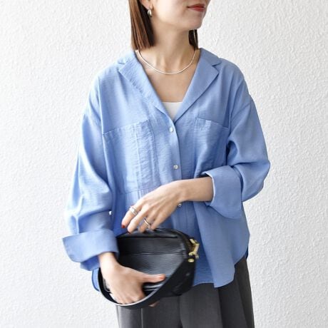 顔まわりがすっきり見えするオープンカラーで、抜け感のある雰囲気に。