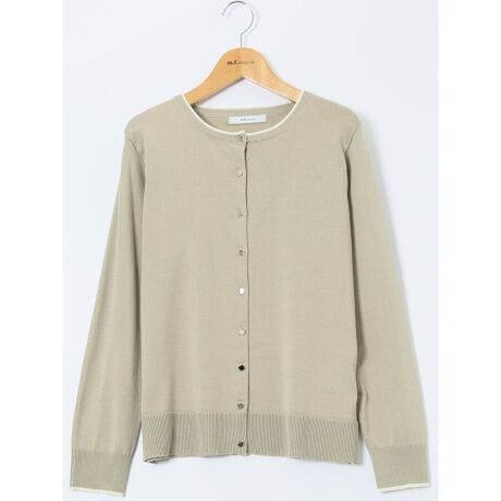 シンプルなデザインで着回しやすい、クルーネックのニットカーディガンです。ゴールドのボタンと、衿・袖口の端配色がポイント。