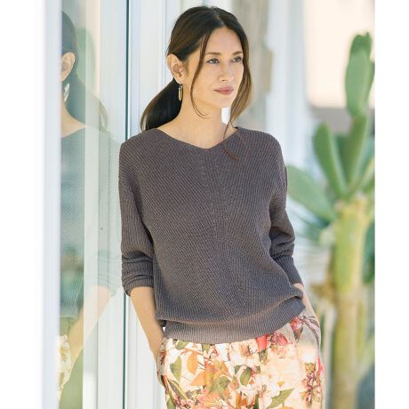 表情のある編み柄が映えるヘリンボーンニット■デザイン前身頃のヘリンボーン柄が印象的なプルオーバーニットです。繊細なメッシュ編みでほどよくトレンド感を取り入れつつ、身体のラインを拾いにくい、程よくゆとりのあるシルエットに仕上げています。さまざまな装いに馴染み、デイリーに取り入れやすいアイテムです。■素材原料にはフレンチリネンを使用しています。リネン特有の清涼感のある質感と、やさしい風合いが特徴です。表面の毛羽感をできるだけ抑え、すっきりと見えるよう工夫した紡績方法で仕上げています。■同素材メッシュニット(KRWRLM0356)