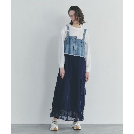 ヴィンテージ感のある上部のオーバーオール風デザインは、高めの切替え位置でスタイルアップを実現。