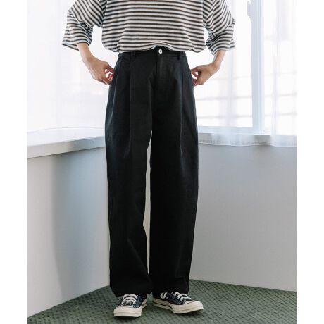 タックを取ってヒップ周りにボリューム感を出したパンツ。シンプルなコーディネートにも使いやすいデザインです。程よい厚みのデニムと甘撚りで畝の立ったコットンツイル使いでオールシーズン着用可能です。パンツと後ろウエストはゴム仕様。両サイドポケットつき。